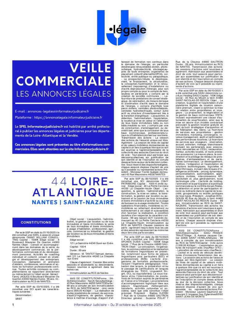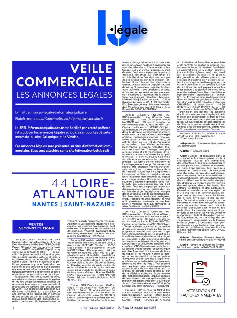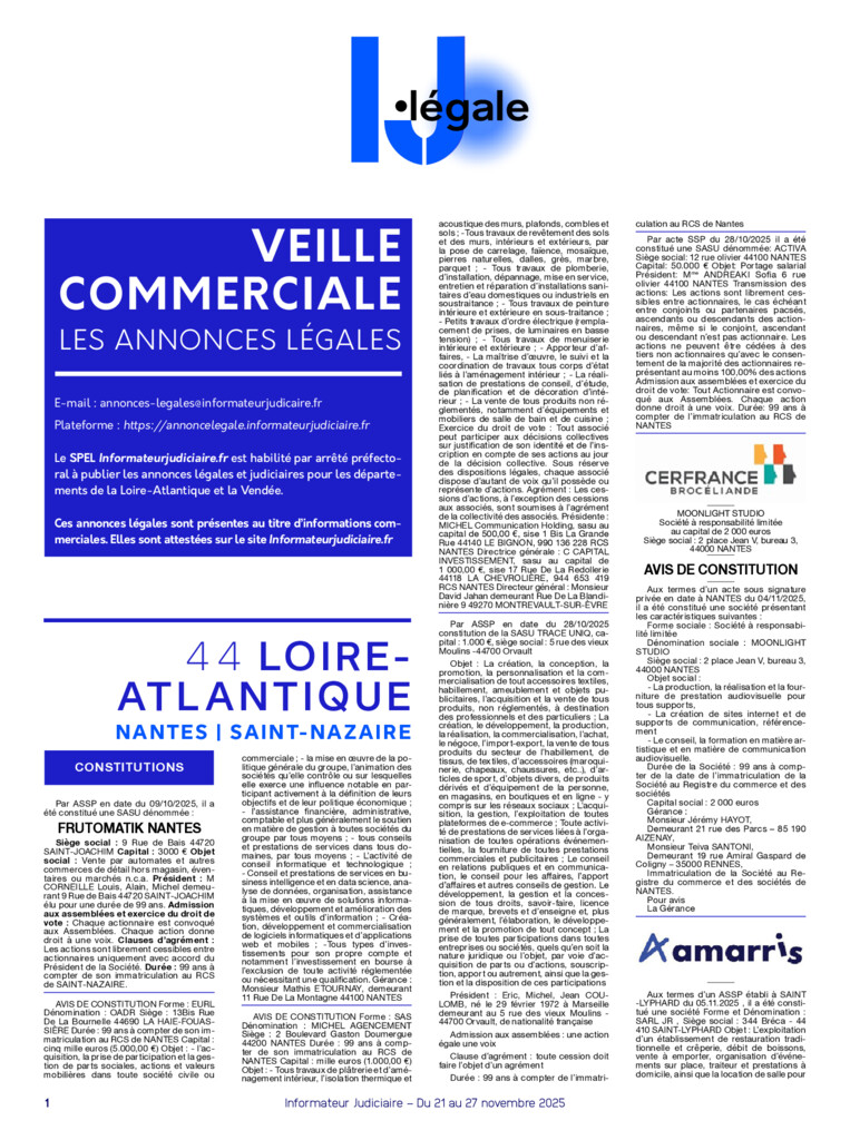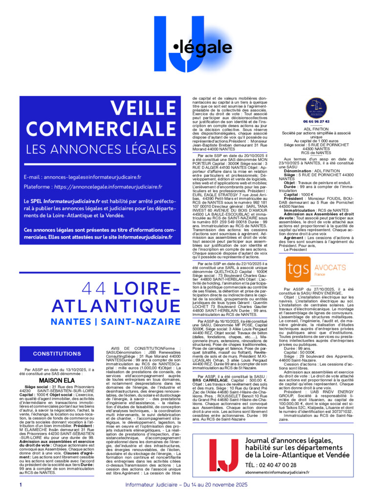 Chaque semaine, retrouvez l’intégralité des annonces légales publiées sur l’ensemble des journaux et services de presse en ligne habilités par la préfecture des départements 44 et 85 (selon l’article 1er de l’arrêté préfectoral du 20 /12/2020 pour la Loire Atlantique et du 29/12/2020 pour la Vendée).