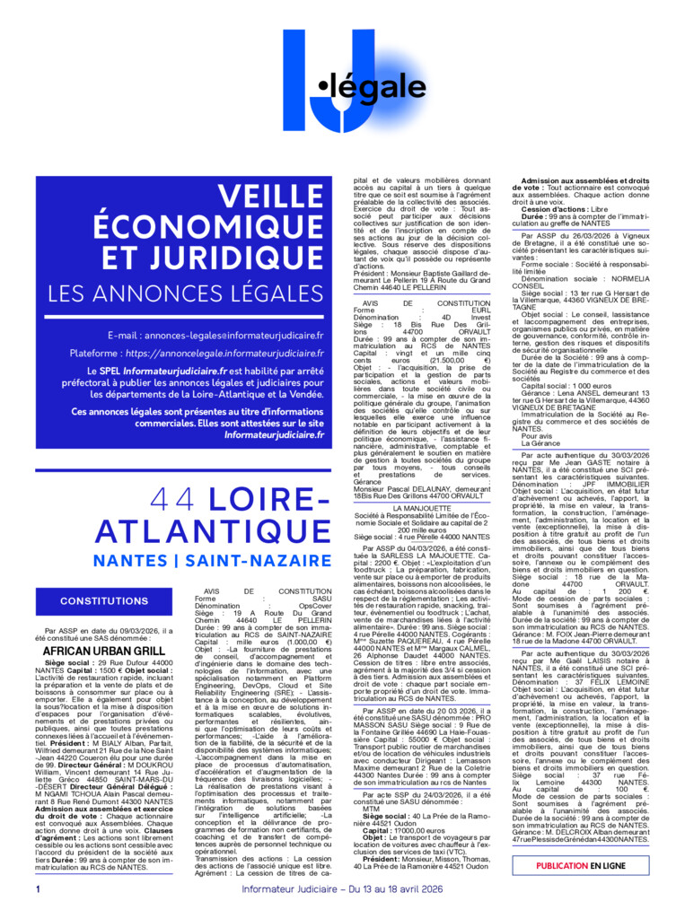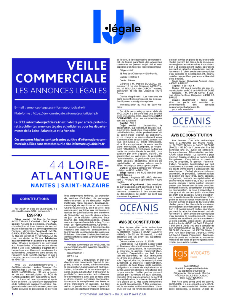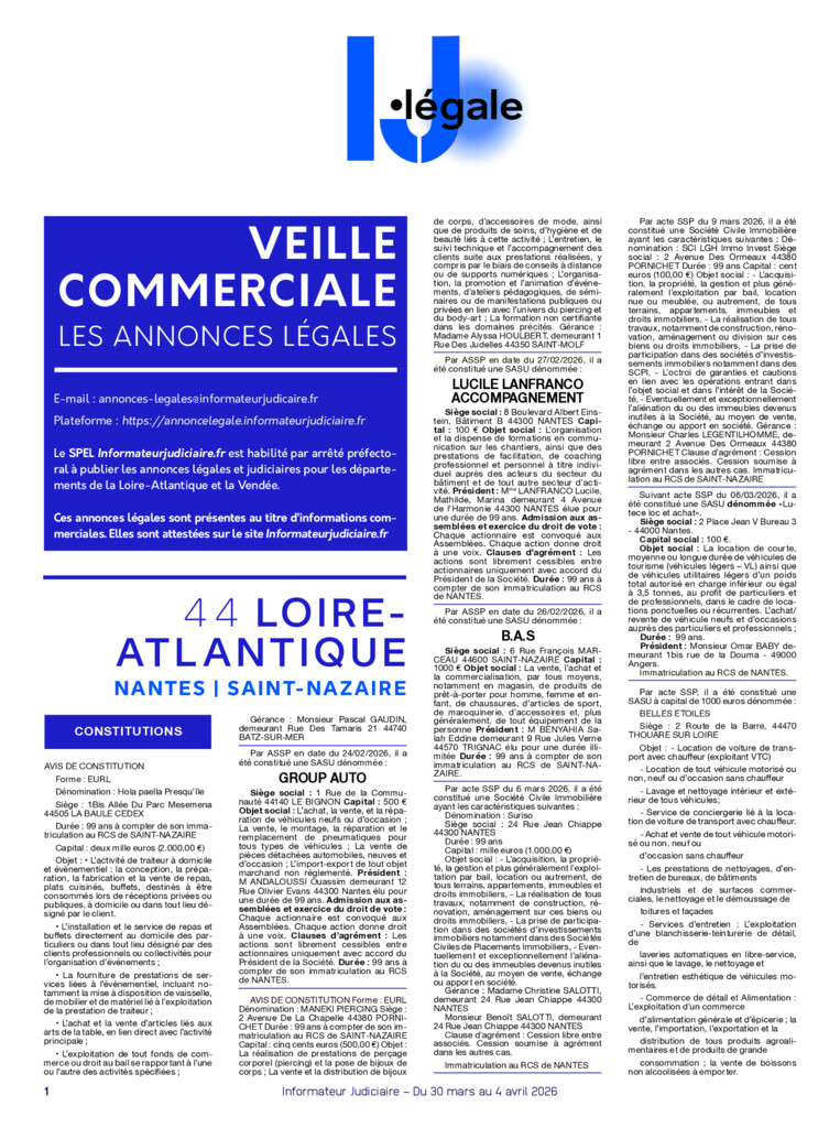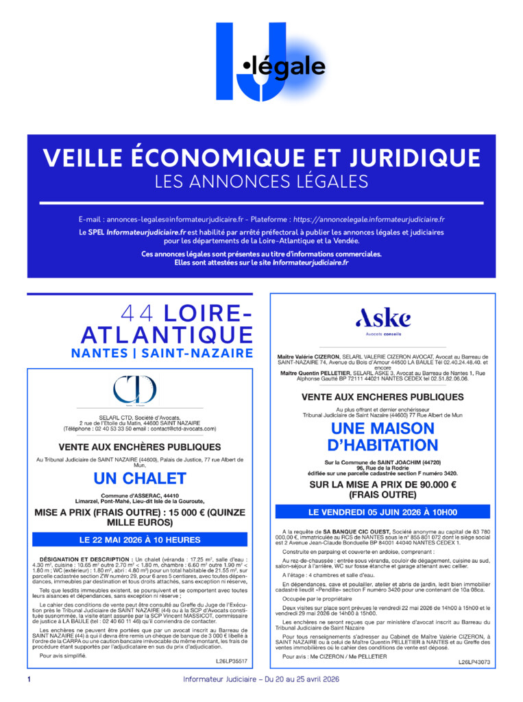 Chaque semaine, retrouvez l’intégralité des annonces légales publiées sur l’ensemble des journaux et services de presse en ligne habilités par la préfecture des départements 44 et 85 (selon l’article 1er de l’arrêté préfectoral du 20 /12/2020 pour la Loire Atlantique et du 29/12/2020 pour la Vendée).